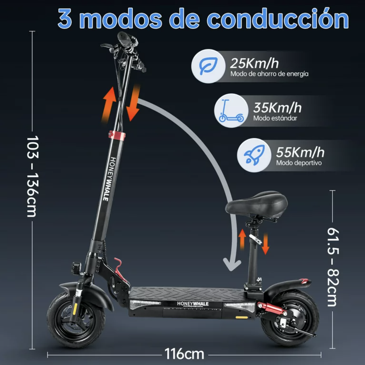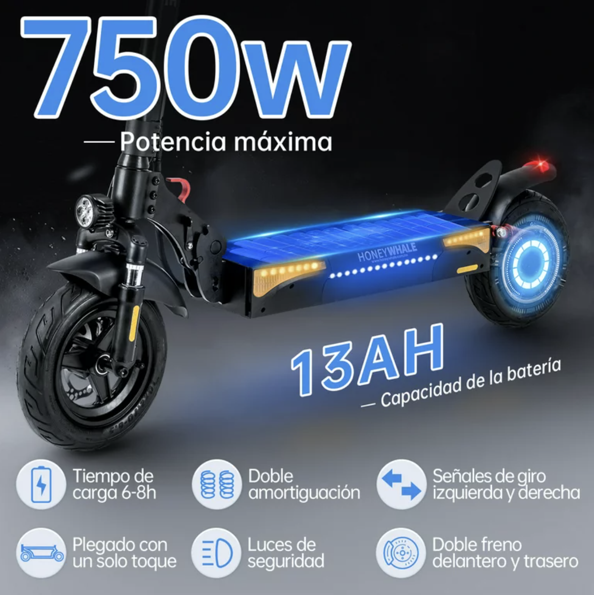 Poder máximo: 750 W;Velocidad máxima: 55 km/h;Autonomía: 33-55 km;Capacidad de batería: 13 AH